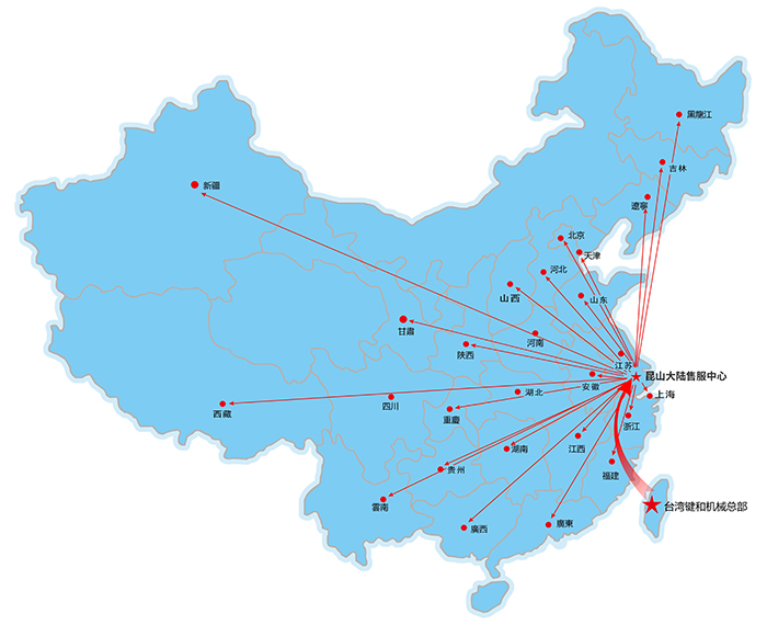 昆山嘉尼赫機(jī)械有限公司為臺灣鍵和機(jī)械股份有限公司在大陸設(shè)定的唯一子公司,本公司于2010年4月在昆山仕泰隆模具城成立,應(yīng)市場需求于2015年2月搬遷至昆山周市鎮(zhèn)成立鍵和中國售服中心。設(shè)有獨立的零配件倉庫及機(jī)臺大修車間,機(jī)臺樣機(jī)展示廳。